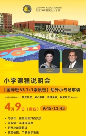 纵观朝阳凯小学课程体系,优势在于孩子们可以在足够早的时候,探索、调整、选择适合自己的节奏,您是不是想有一个学业有成、身心健康、思维活跃、眼里有光的孩子?4月9日的课程说明会和小学部校长面对面,幼升小专场解读,双轨路径的抉择。
